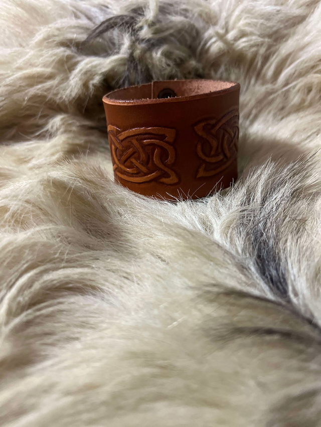 Bracelet avec motif entrelacs doubles, repoussé et teint à la main. Couleur marron foncé lisse. Convient pour un tour de poignet de 22 cm.