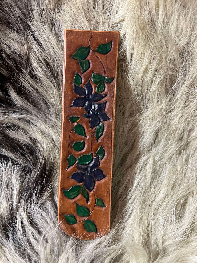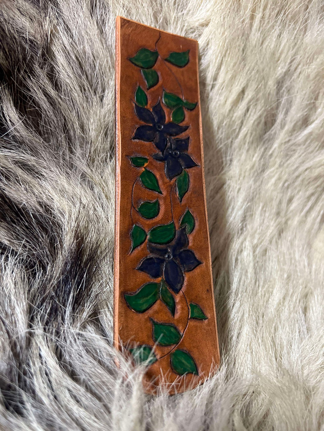 Marque page composition florale bleu, fond lisse. Motif entièrement repoussé et teint à la main.