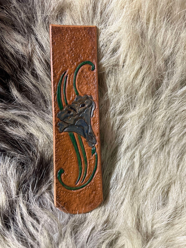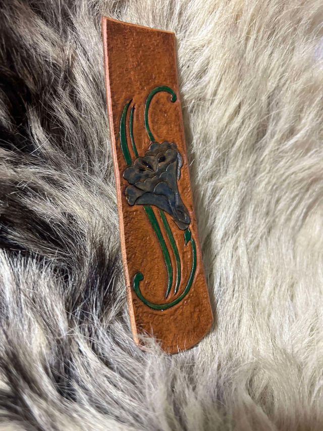 Marque page fleur bleu, fond granuleux. Motif entièrement repoussé et teint à la main.