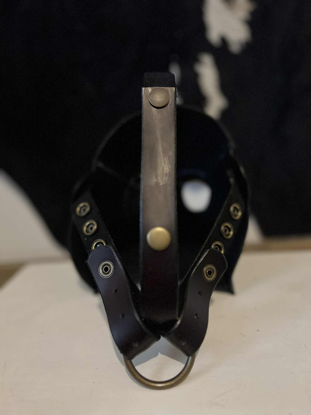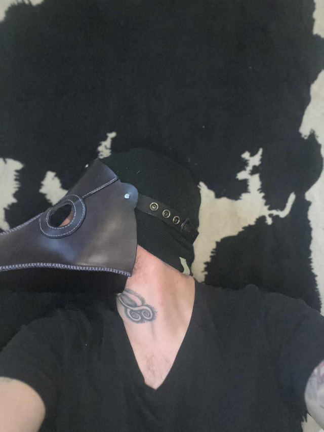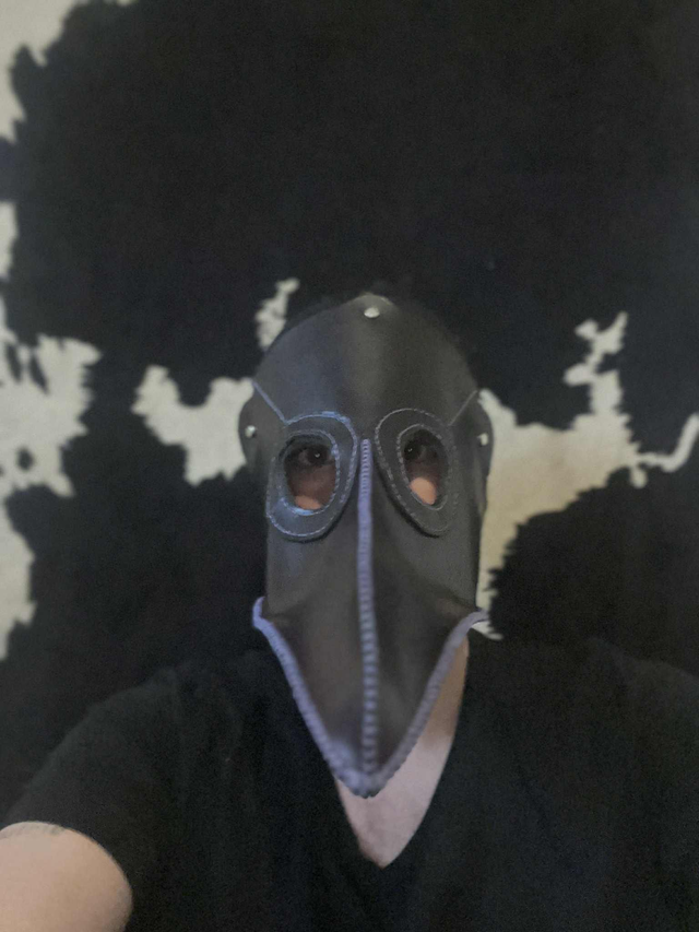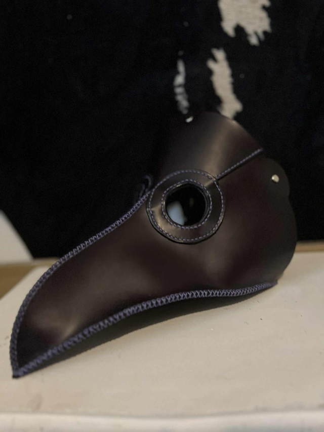 Masque intégral du docteur de la peste, le cuir est de couleur noir violacé, le tout surpiqué d'un fil violet et assemblage entièrement à la main.
