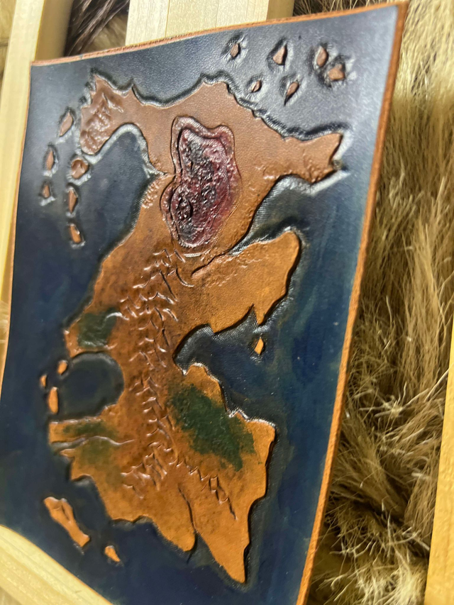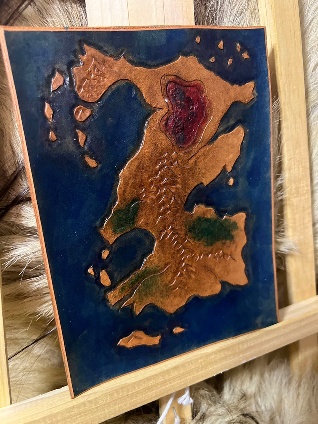 Tableau représentant une île et ses presqu'îles. Le morceau de cuir présentait une cicatrice, et au lieu de la supprimer, j'ai donc décidé de la mettre en valeur en y incorporant un cratère.