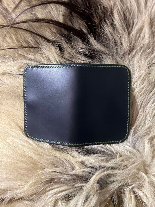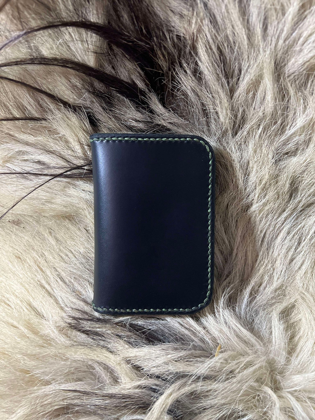Porte carte pliant noir et vert avec surpiqure verte à deux compartiments. Chaque compartiment peut contenir jusqu'à 3 cartes maximum. Fermoir pression