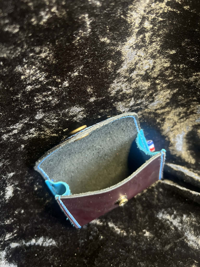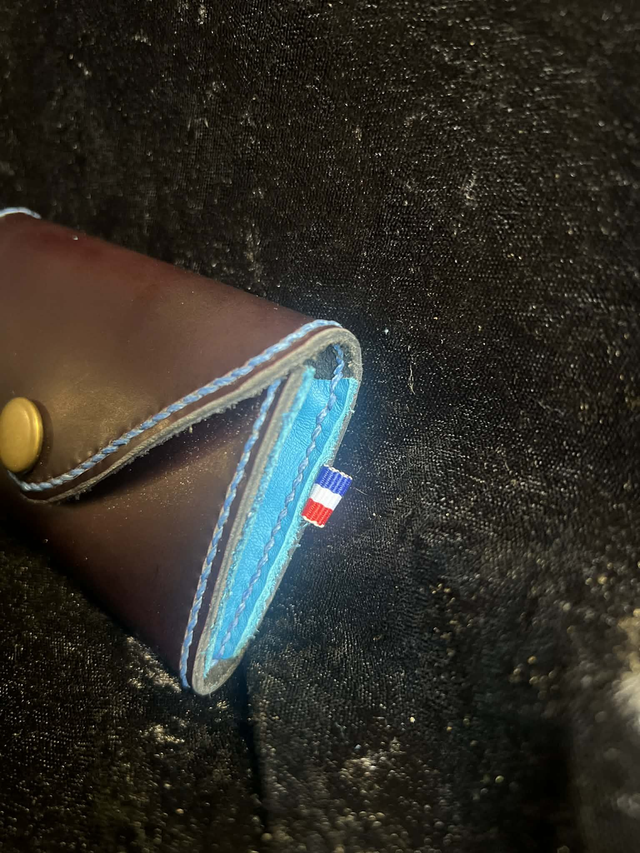 Porte monnaie de couleur noir violacé et bleu, surpiqûre bleu entièrement assemblé à la main. Cuir rigide.