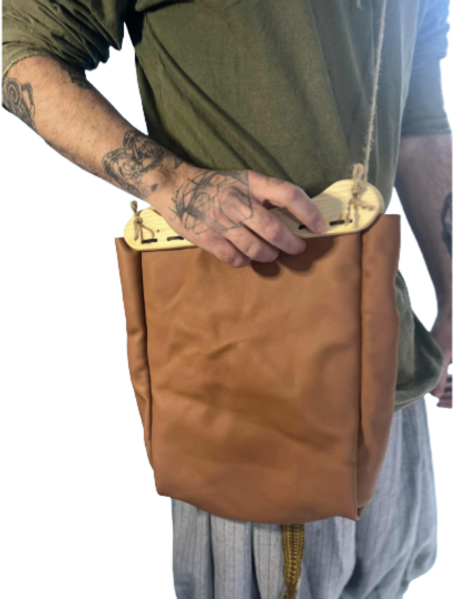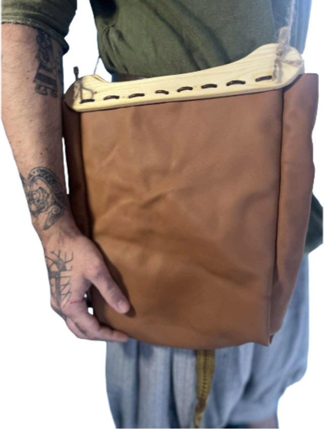 Sac bandoulière viking historique, anses en bois sourcé Haithabu, en Allemagne. Entièrement assemblé à la main, cuir souple cognac. Les Anses proviennent de chez " Les Boucliers De Volund ",et mesures 28cm de long pour 5 à 3 cm de large.
