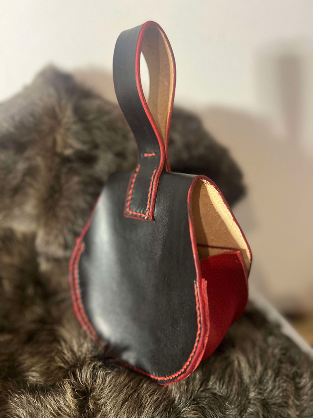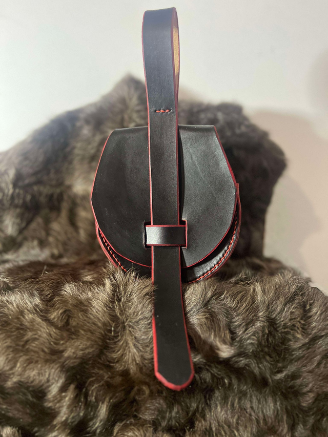 Sacoche médiévale d'inspiration Tarsoly de couleur noir et rouge, fermoir et passant ceinture d'une seule et même pièce. la sacoche se fixe à la ceinture par le biais de la boucle formée sur le dessus. Entièrement réalisée à la main.