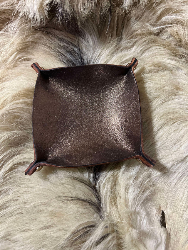 Vide poche cuir avec doublure cuir fantaisie bronze brillant.